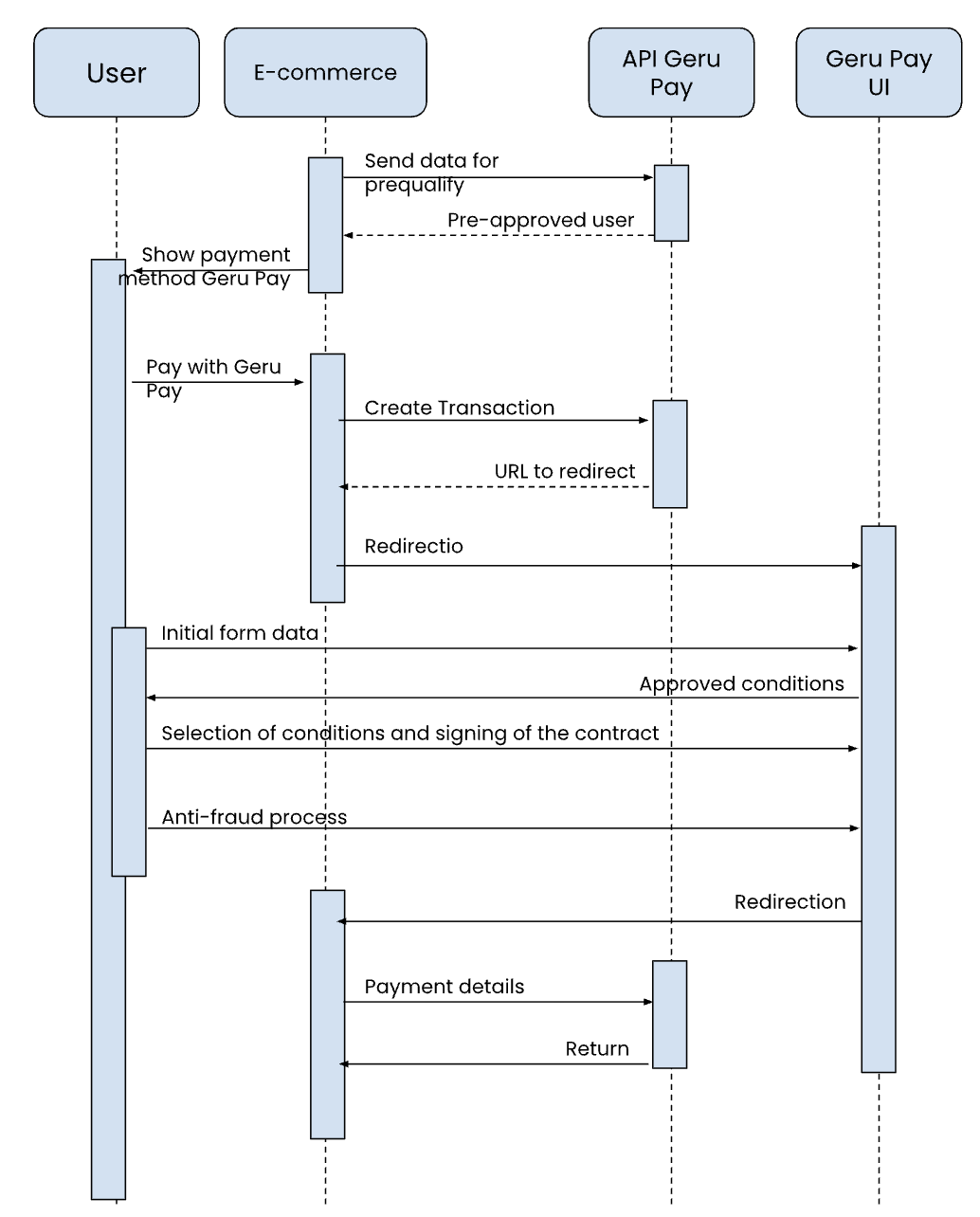 Antes que o cliente chegue à página de finalização do pedido, ocorre um processo de pré-qualificação. Os dados de pré-qualificação são enviados e a resposta indica se a opção de pagamento Geru Pay BNPL estará disponível para aquele cliente.