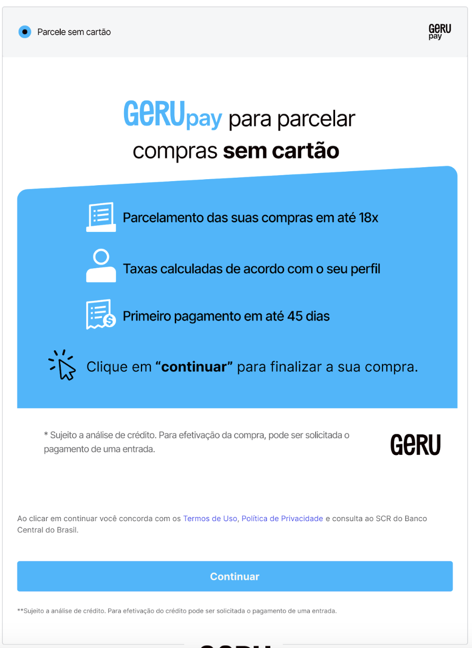 Se a pré-aprovação for concedida, a opção de pagamento Geru Pay BNPL é exibida. Quando o cliente clica no botão Finalizar Compra, os dados descritos na seção Dados para Criação da Transação são enviados. Assim que os dados são enviados, um token é gerado para identificar a transação.